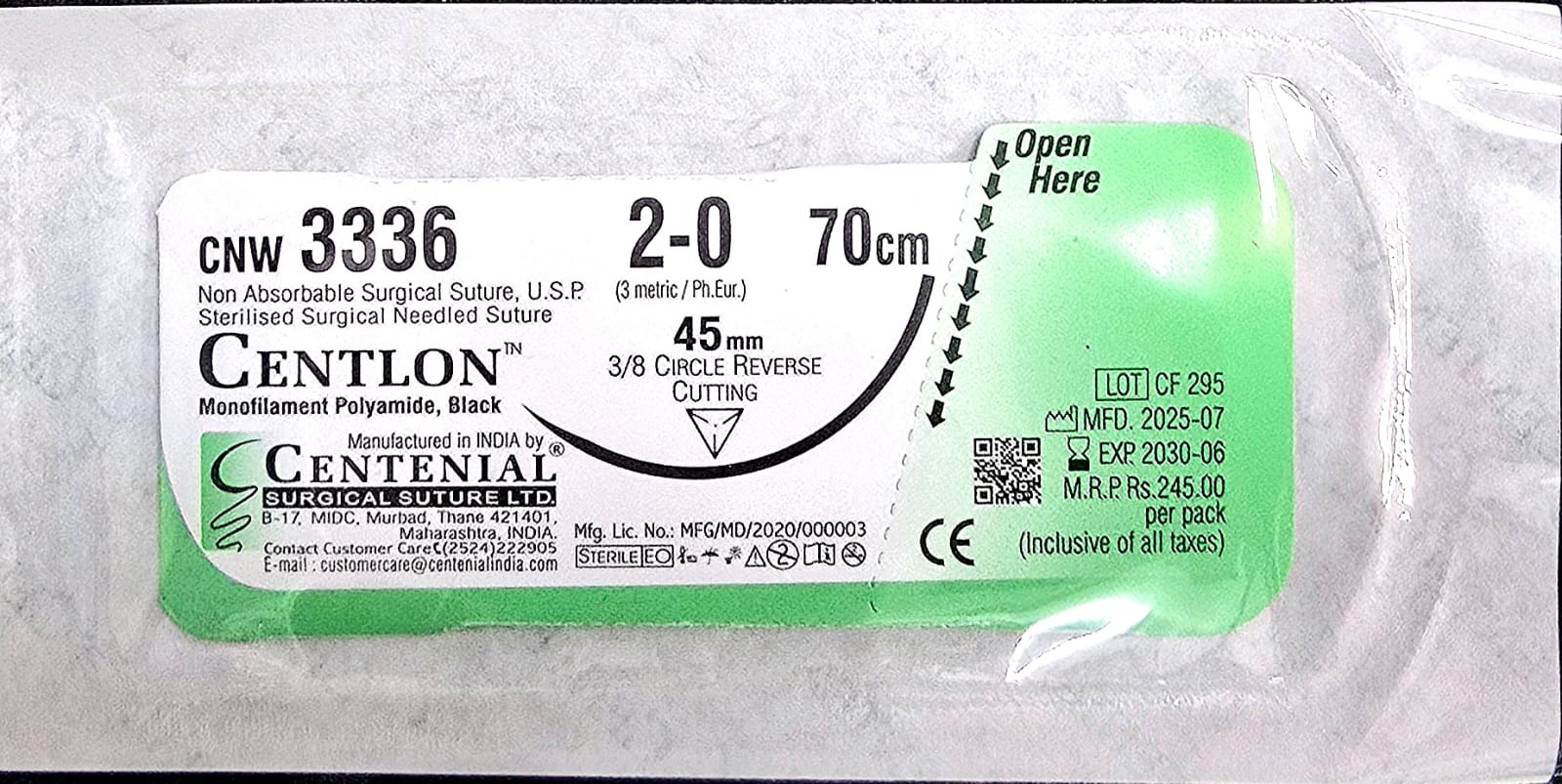 The Centlon 2-0 Reverse Cutting Suture 70cm CNW 3336 is a high-quality, sterile, non-absorbable monofilament nylon suture designed for soft tissue approximation and ligation. Its reverse cutting needle allows smooth and precise penetration through tougher tissues, making it ideal for general surgery, plastic surgery, and cosmetic procedures. The black nylon construction ensures excellent tensile strength, consistent knot security, and reliable performance during surgical closure.