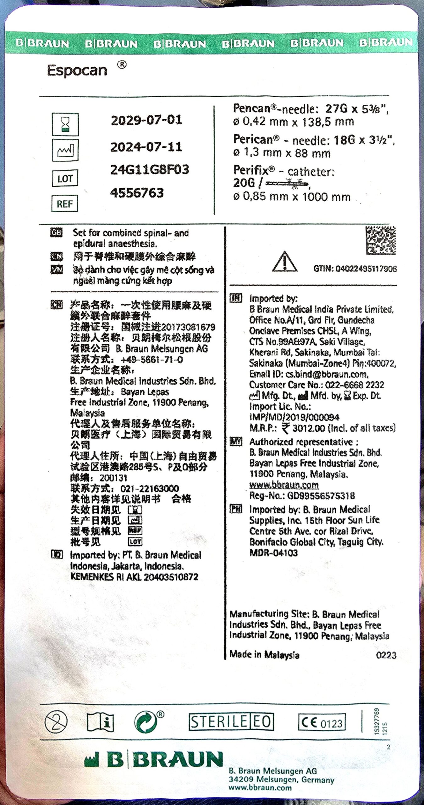 The B. Braun Espocan Kit with 27G spinal needle is a high-quality, single-use set designed for performing combined spinal-epidural (CSE) anesthesia. This innovative kit ensures precise needle placement, reducing patient discomfort while delivering effective and immediate pain relief. Ideal for surgical and labor procedures, the kit is built to meet the rigorous demands of modern medical environments.