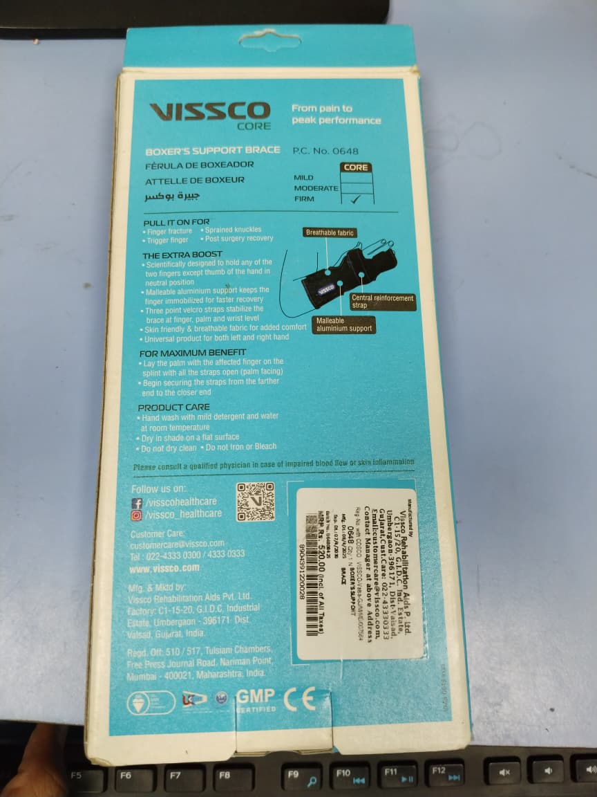 The “Boxer Support Brace (P.C NO -0648)” refers to a specific type of brace designed to immobilize and support the hand and fingers, particularly for conditions like a boxer’s fracture (fracture of the fourth or fifth metacarpal), other finger injuries, post-surgery recovery, and trigger fingerÂ