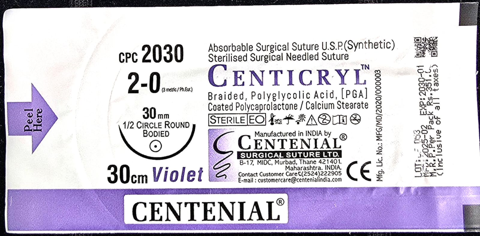 The Centicryl 2-0 Round Body 30cm surgical suture CPC2030) is a premium absorbable braided suture made from Polyglycolic Acid (PGA), specifically designed for reliable and efficient surgical performance. Its 2-0 USP size and 30cm length, combined with a round-bodied needle, ensure precise tissue handling and smooth passage through tissue with minimal trauma. This makes it suitable for soft tissue approximation, ligation, and a wide range of general surgical procedures.