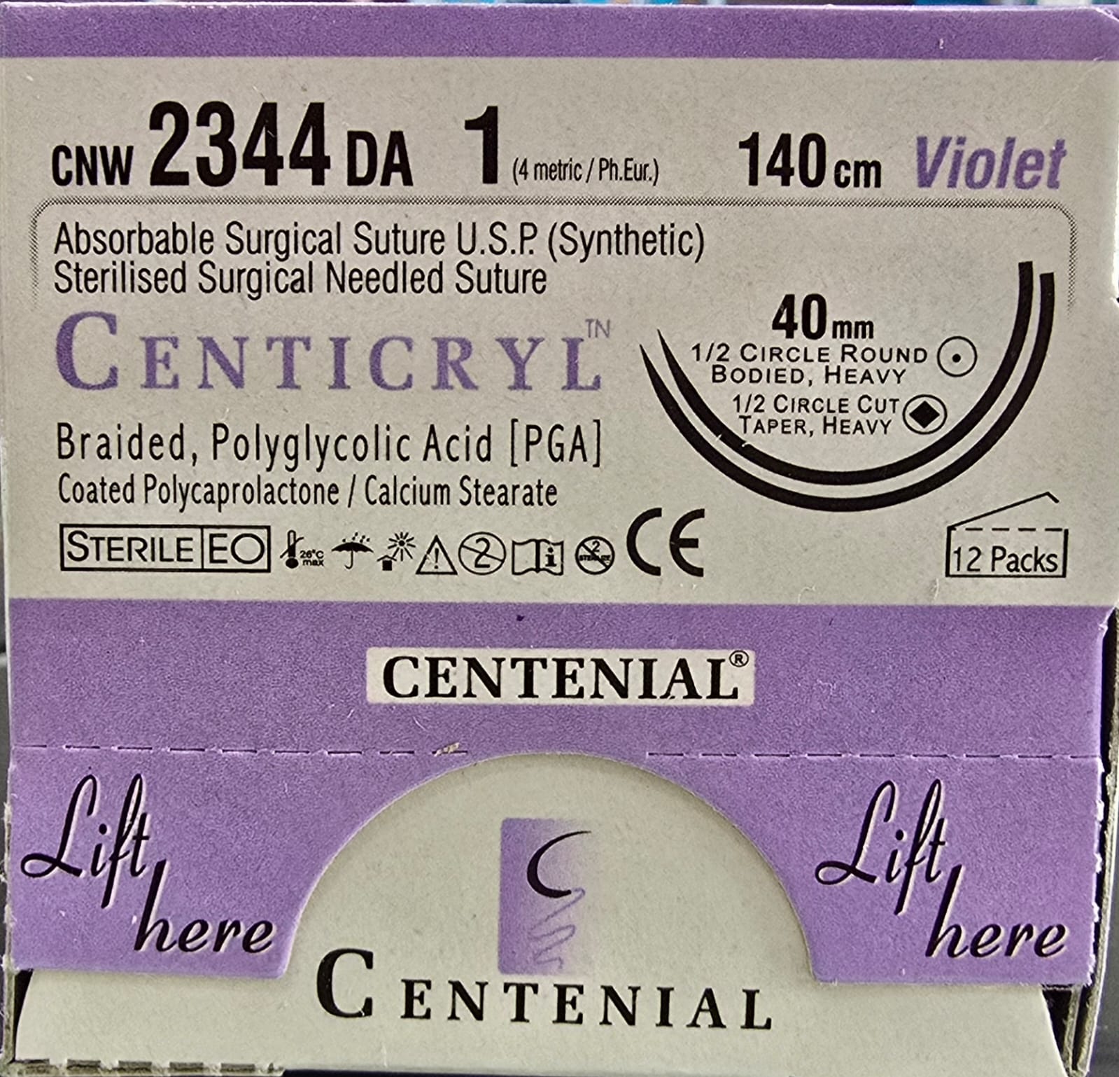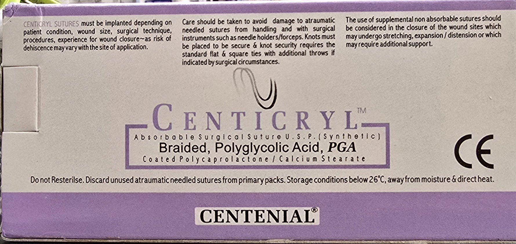 The Centicryl No.1 Round Body 140cm absorbable surgical suture is a high-quality, synthetic suture manufactured by Centennial Surgical Suture Ltd (also known as Life Care or Centenial). Designed for general soft tissue approximation and ligation, this suture provides surgeons with a reliable solution for effective wound closure. Its smooth, round body needle ensures minimal tissue trauma while allowing precise handling and secure knotting, making it suitable for a wide range of surgical procedures across general surgery, gynecology, and orthopedics.