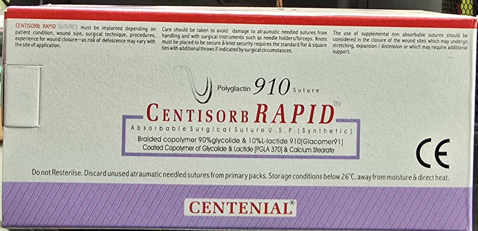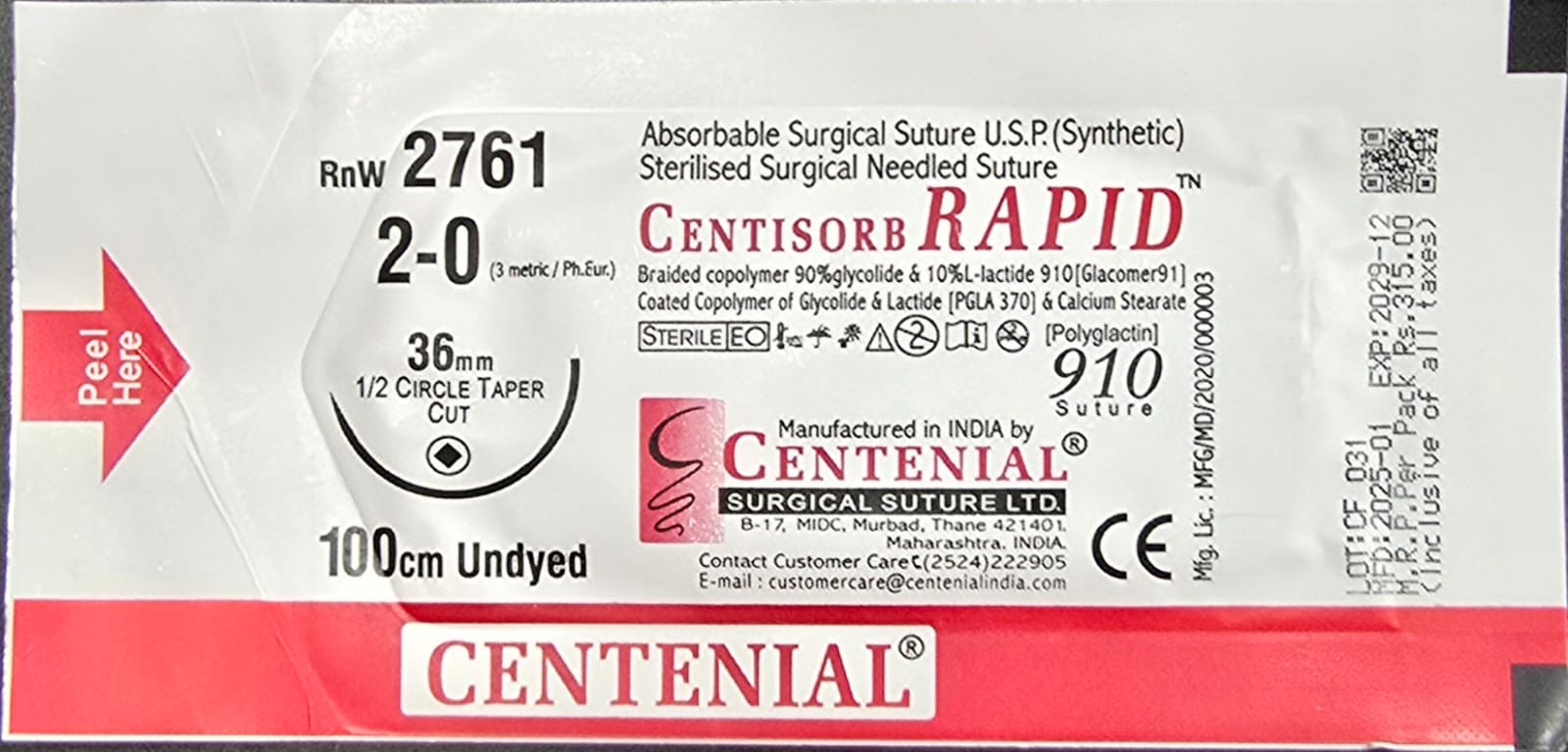 The Centisorb Rapid 2-0 100cm RnW2761 absorbable surgical suture is a premium rapid-absorbing Polyglactin 910 suture designed for procedures requiring short-term wound support. Manufactured by Centenial Surgical Suture Ltd, this suture ensures smooth passage through tissues, strong knot security, and minimal tissue reaction, making it a preferred choice for surgeons.