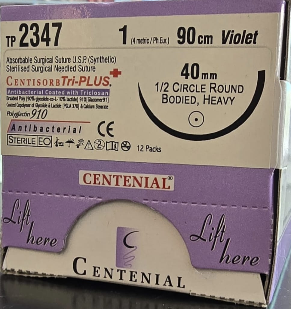 The Centisorb Tri-Plus No-1 90cm Round Body absorbable antibacterial suture is a premium braided surgical suture designed to provide reliable soft-tissue closure and ligation across a wide range of surgical procedures. Manufactured by Centenial Surgical Suture Ltd, this high-quality suture incorporates antibacterial properties to help minimize the risk of postoperative infections while supporting consistent and predictable tissue healing. Its smooth, coated braided structure allows for minimal tissue drag, enhanced handling, and secure knot-tying, making the Centisorb Tri-Plus No-1 90cm Round Body absorbable antibacterial suture an ideal choice for general soft-tissue approximation and ligation in both routine and complex surgical procedures. Surgeons rely on this suture for efficiency, precision, and safety, ensuring optimal outcomes in soft-tissue management.
