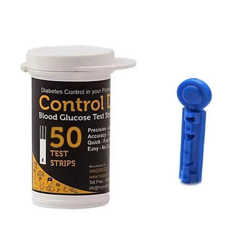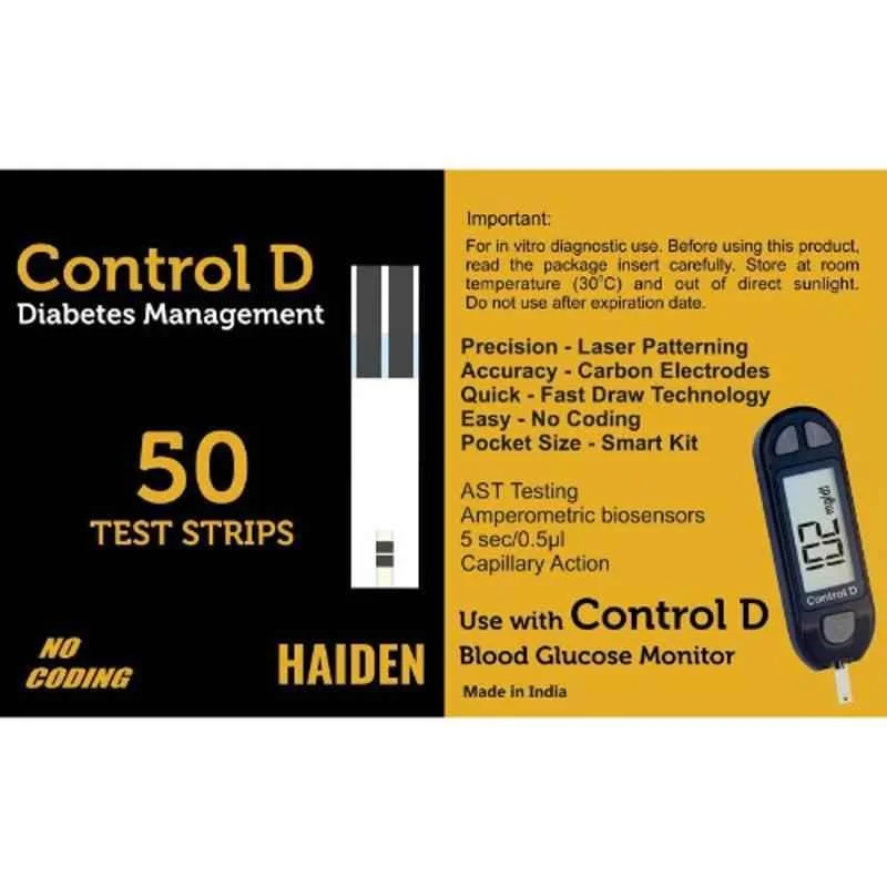 Control D Blood Glucose Test Strips are designed to deliver fast, accurate, and reliable blood sugar readings for individuals managing diabetes. Each pack contains 50 high-precision strips that utilize advanced biosensor technology to ensure consistent results with minimal blood sample requirements. These strips are exclusively compatible with Control D glucometers and feature a no-coding design, making them easy to use for both clinical and home settings. With a quick response time of just 5 seconds and a sample size as low as 0.5µL, they offer a comfortable and efficient testing experience. Manufactured by Haiden Technology Pvt. Ltd., the product reflects a commitment to quality and user convenience, helping users maintain effective diabetes control anytime, anywhere.