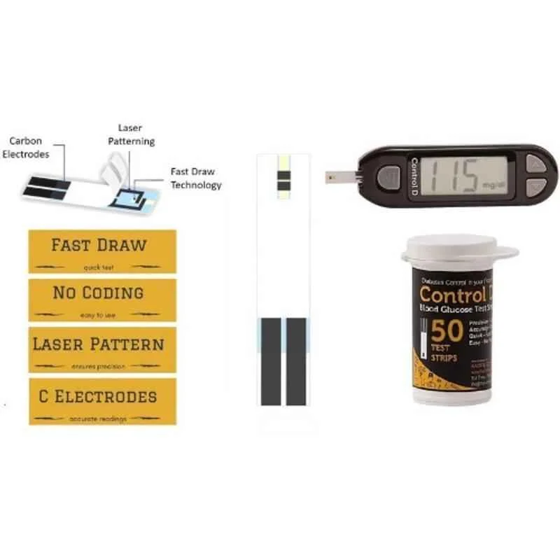 Control D Test Strips a trusted name in diabetes care. Each strip is embedded with advanced amperometric biosensors that detect blood glucose levels using a minimal blood sample—just 0.5µL—and deliver results in under 5 seconds. The strips feature carbon electrodes with laser patterning, ensuring high precision and consistency across tests. This tight manufacturing tolerance eliminates the need for manual coding, reducing user error and improving convenience.