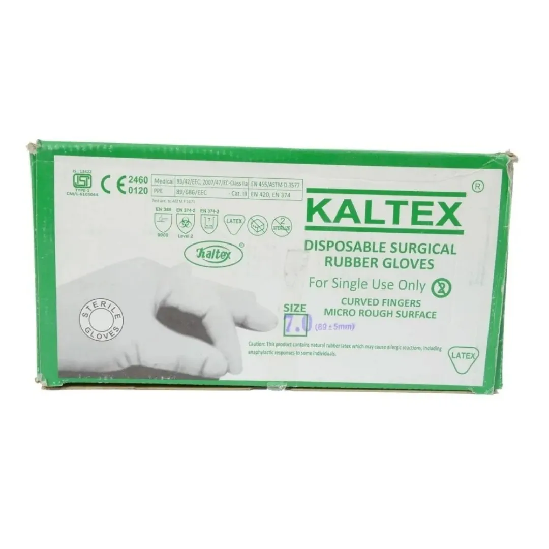 Kaltex Disposable Surgical Rubber Gloves are sterile, single-use latex gloves designed for precision and safety in surgical environments. With anatomically curved fingers and a micro rough surface, they offer enhanced grip and comfort during long procedures. These gloves meet international standards including CE, ISO 13485, EN 455, and ASTM D-3577, ensuring high-quality protection for both patients and healthcare professionals. Available in sizes from 5.5 to 9.0, they provide a secure fit for all hand types, making them ideal for hospitals, clinics, and operating theaters.
