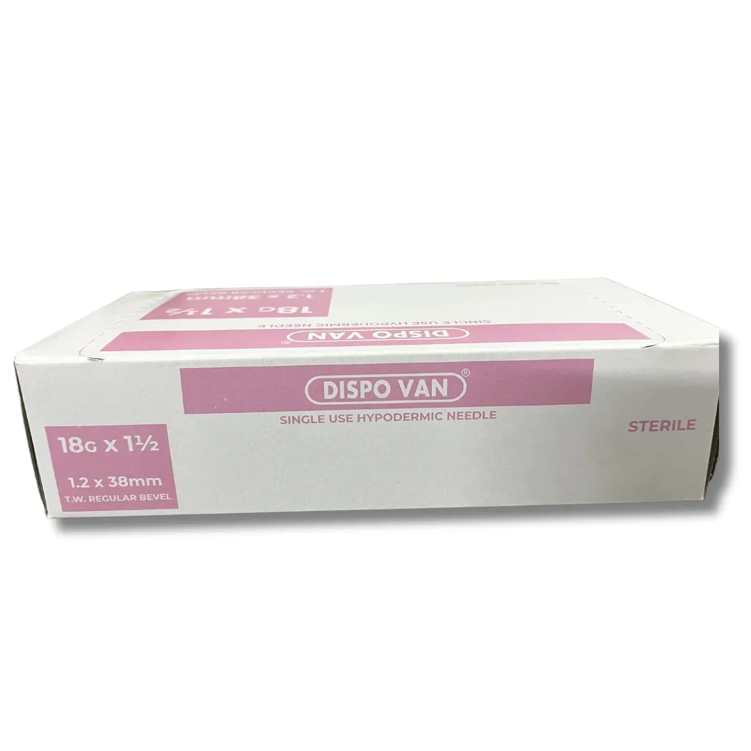DISPO VAN hypodermic needles are designed for precision, safety, and compatibility with a wide range of clinical applications. The 18-gauge needle with a 1½ inch length and regular bevel is engineered to meet the demands of high-viscosity fluid transfer and deep tissue penetration.