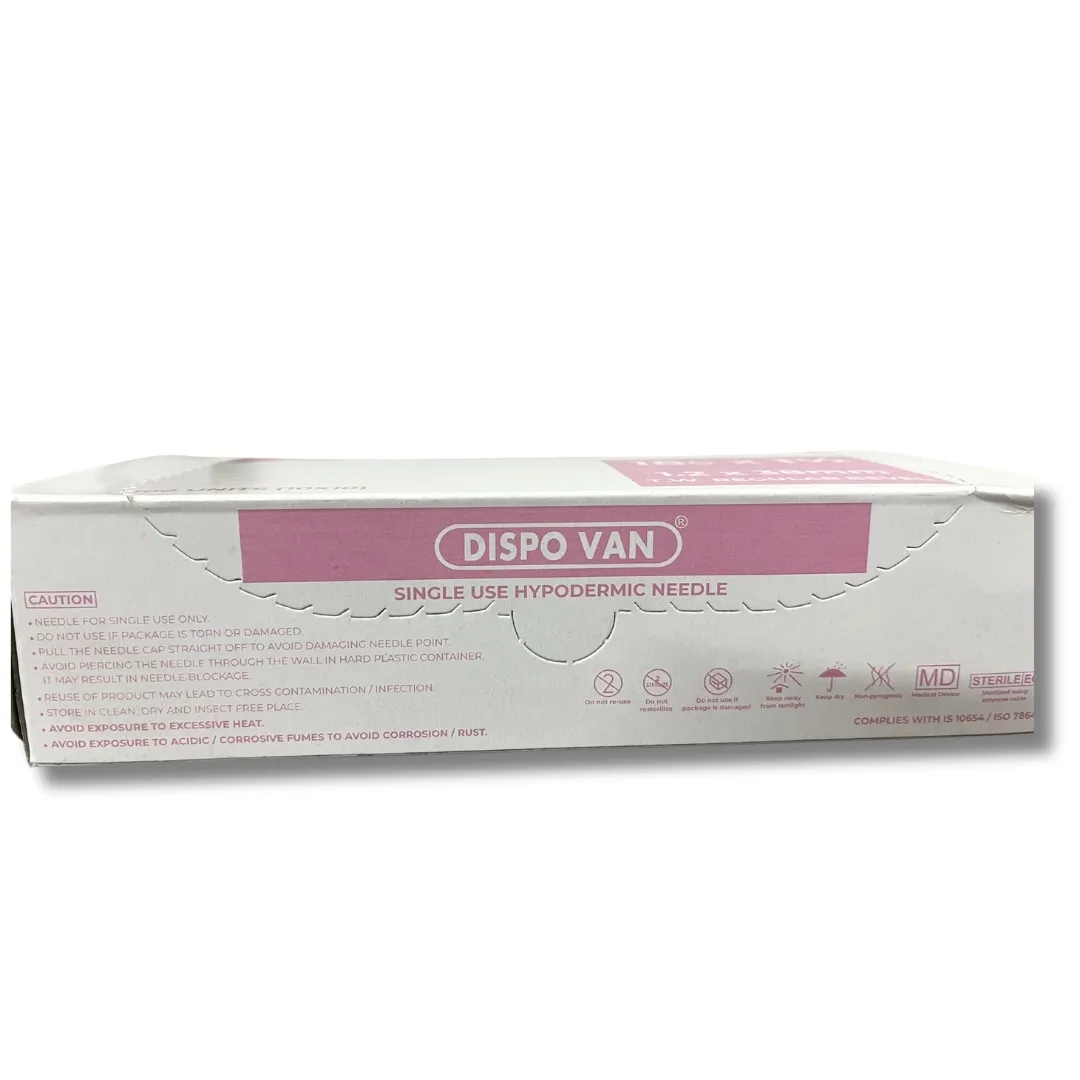 Tags: 1.2 x 38 mm needle, 18G injection needle, DISPO VAN hypodermic needle, EO sterilized needle, Pink hub needle, Regular bevel needle, Single use medical needle