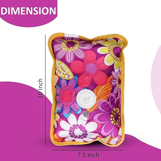 This electric hot water bag is a modern, safe, and efficient solution for delivering therapeutic warmth and pain relief. Designed with a vibrant floral print featuring pink, blue, and yellow flowers on a purple background, it combines functionality with aesthetic appeal. The pad is bordered in yellow and includes a central circular heating unit labeled “LUMONY,” which regulates the temperature and ensures consistent heat distribution.