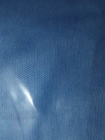This is a single-use surgical drape manufactured by G. Surgiwear Limited. It is made from a non-woven, fluid-proof material that minimizes the transfer of fabric fibers into the surgical wound. The drape measures 240 x 340 cm and features two 5 cm diameter apertures with leg holders for a precise and secure fit during surgery.