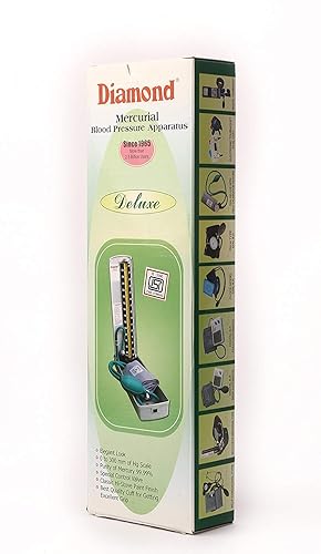 The Diamond Mercurial Blood Pressure Apparatus Deluxe is a reliable, hospital-grade device used for accurate blood pressure measurement through a mercury column. Trusted since 1985, it features a calibrated glass tube, durable inflation bulb, and a secure fabric cuff. Ideal for clinics, hospitals, and home use, it operates via the auscultatory method with a stethoscope. Known for its precision, ease of use, and elegant design, it’s suitable for both professional monitoring and gifting. The packaging includes visual instructions and highlights its international quality standards.